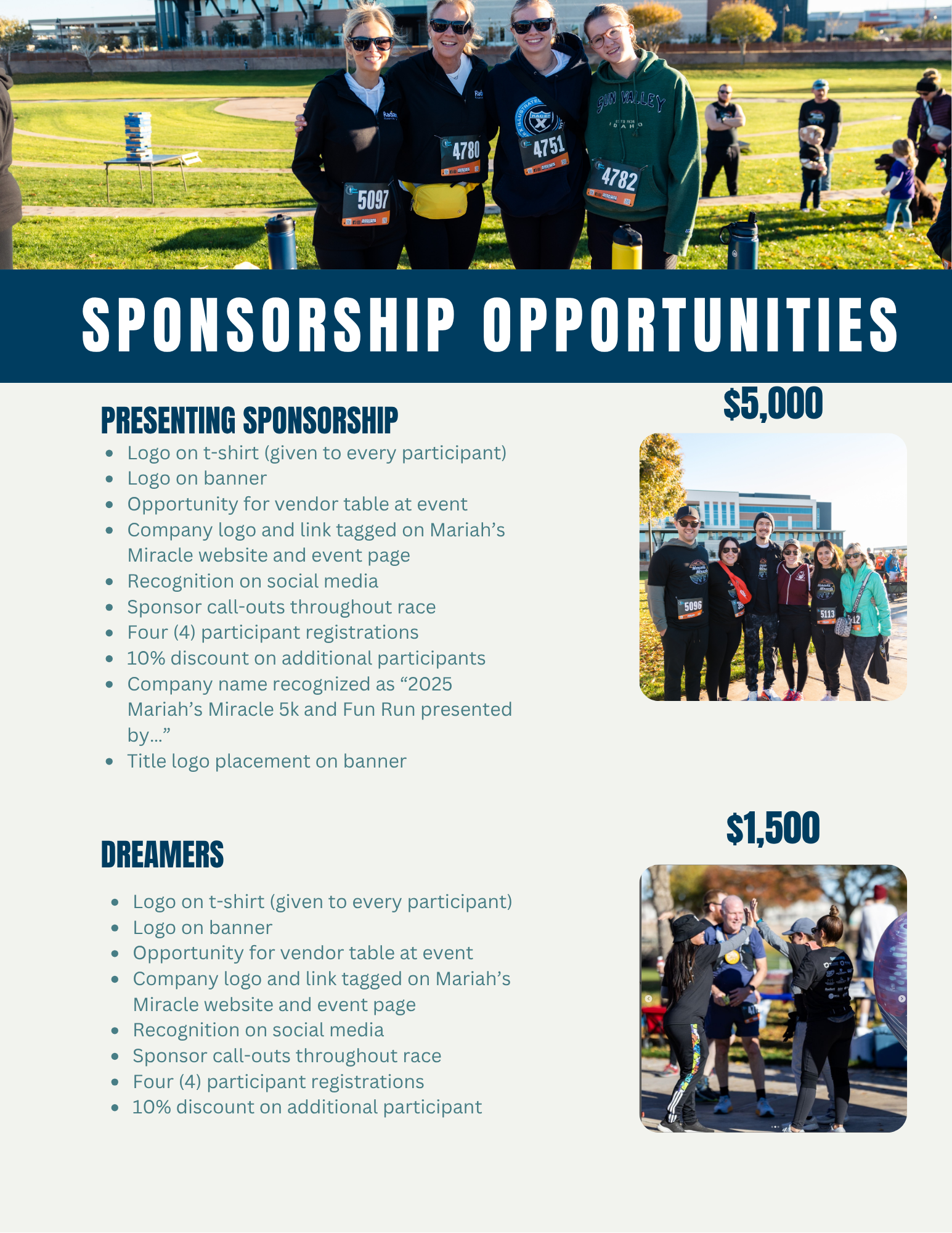 Mariah’s Miracle is excited to gear up for our annual **Dash for Dreams 5K + Fun Run** this January, and we’d love to have you join us as a sponsor! We offer a wide range of sponsorship opportunities—from event signage and race-day features to swag bag inserts and more—each designed to spotlight your business while making a real difference for children with special needs. Your support helps fund life-changing therapies, equipment, and resources for families right here in our community.